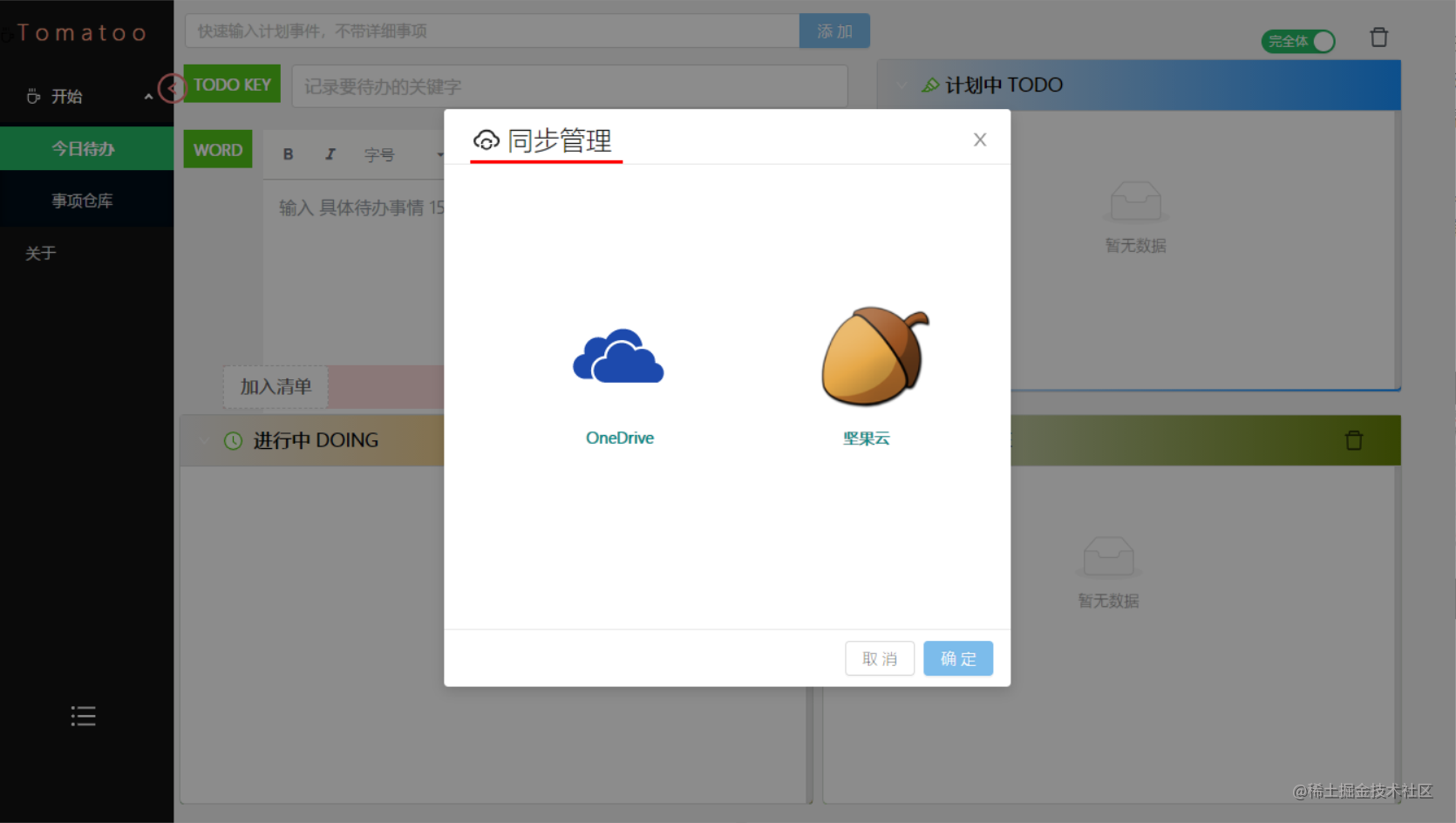 如果说一个本地的客户端能满足不少固定场景的需要,那么一个能将数据同步到云端的客户端,无疑大大地扩展了应用的使用场景,能在更多地方或是更多设备上用上自己熟悉的效率工具也是Tomatoo开发的初衷。 在观察了不少云盘,云存储服务后,目前将眼光落在了坚果云上,将它作为Tomatoo现阶段的云端容器,当前同类型的云盘也已有了不少好的选择,而最终选择了坚果云主要是有这些考虑:
