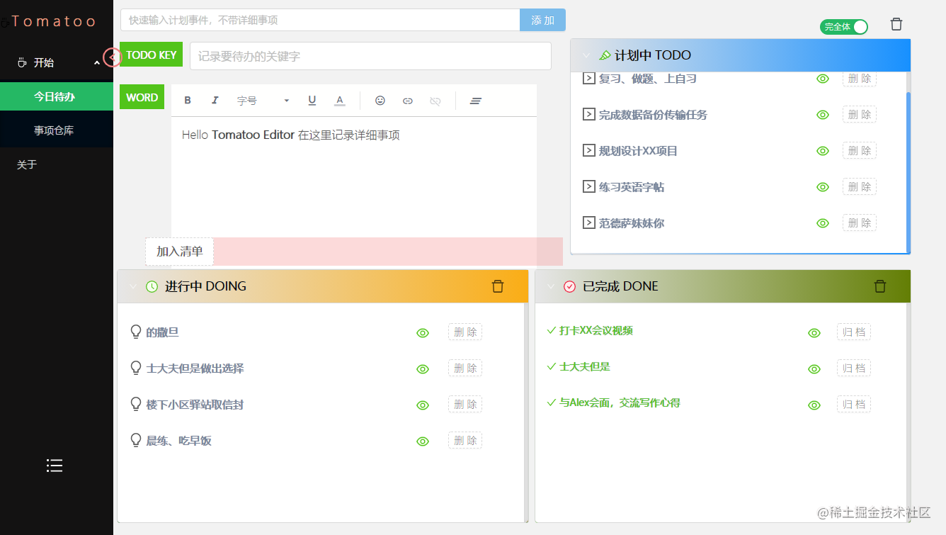 };在编辑器这个主要组件里,放置了一个需被观察的数据对象,而对象中包含的三个数组分别对应了编辑器的三种形态,即计划中,进行中和已完成这三种状态,考虑到各种数据共享情况的需要,这里我给它设置4个Action操作,一个能取到总的editor对象,而另外三个则能分别get到三种形态的具体数据。总的来看来Store层这里的数据结构并没有很复杂,而Tomatoo的大部分本地状态存储/共享等功能也将围绕着这三个List来展开。