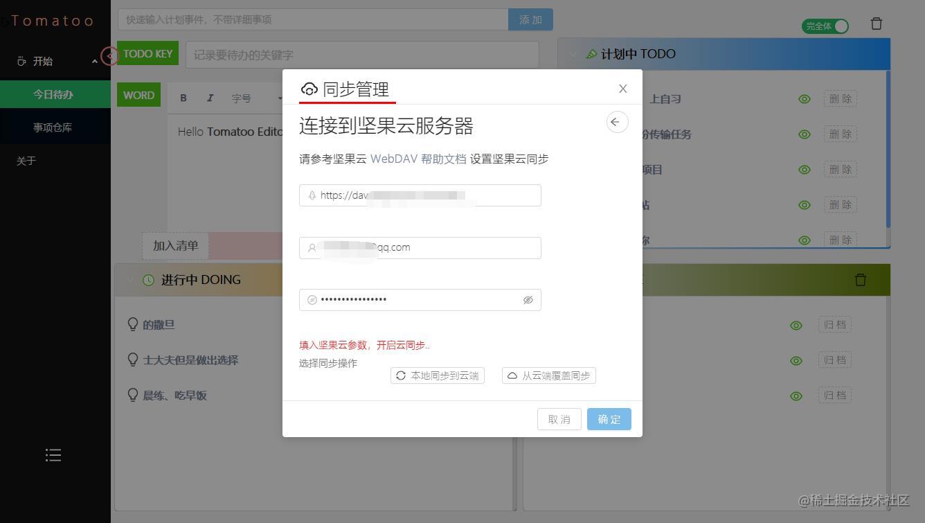 | Tomatoo提供了用户填入云盘参数的入口,包括连接到坚果云的账号和坚果云的服务器地址。当用户首次次输入后,系统将会记住表单的信息并把它存储到本地的数据库里,以及Mobx Store中作备份。当用户刷新页面或者再次进入到笔记里面的时候,上一次记录的信息将会随系统自动填入。 |